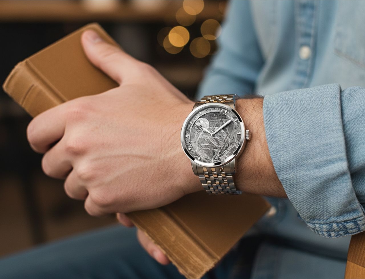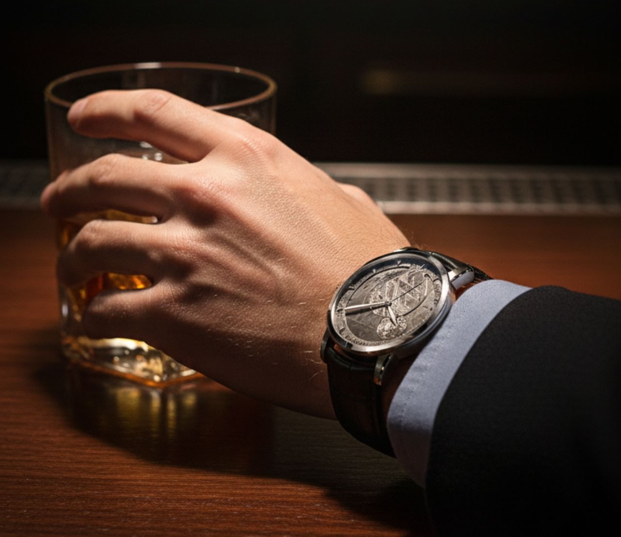 薄明かりの中でこそ映える、ムーンフェイズの柔らかな光。隕石の輝きとともに、手元が大人の余裕をさりげなく演出します。