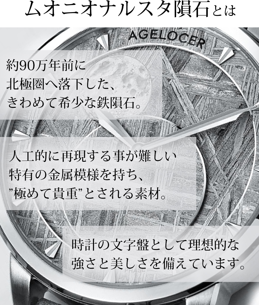 ムーンフェイズは本来、高級機械式時計にのみ搭載される機構ですが、AGELOCERは高度な精度を維持しながらより手に届きやすい価格帯を実現しました。