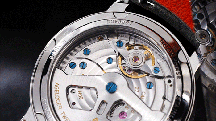 このムーブメントは27個のルビーベアリング、ロジウムメッキ仕上げのムーブメント、ポリッシュ仕上げのエッジ、ブラッシュ仕上げの面取り、精緻なコート・ド・ジュネーブ装飾、サンバースト模様、金文字の刻印、ブルーのネジ、鏡面研磨されたネジ頭が特徴です。