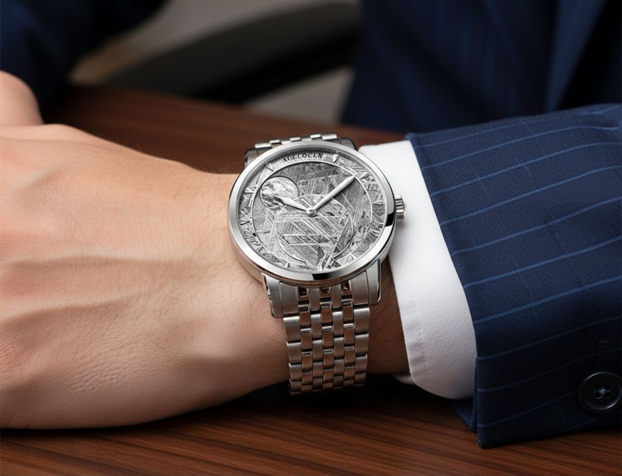 上質なスーツにも自然に馴染む40mmのバランス設計。手元にのぞく隕石の模様が、静かに“個性”を語ります。